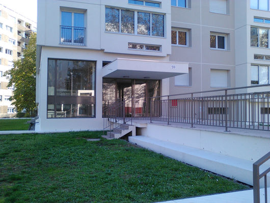 Notre projet d'accessibilité consiste en la création d'un ascenseur extérieur et d'une passerelle qui permettent de relier le niveau de la rue et l'entrée principale. Nous proposons également la mise en place d'un monte personne intérieur au droit du hall d'entrée pour qu'une personne à mobilité réduite puisse atteindre les ascenseurs.