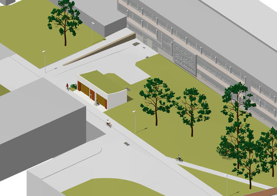 Nous avons optimisé les dimensions afin de permettre la conservation de l'arbre sur site et la longueur et de limiter à une seule sortie de secours. Ainsi, nous abritons à l'intérieur deux rangées de vélos superposés avec un entracte de 0,40m, plus six colonnes de consignes à colis sous un auvent extérieur.